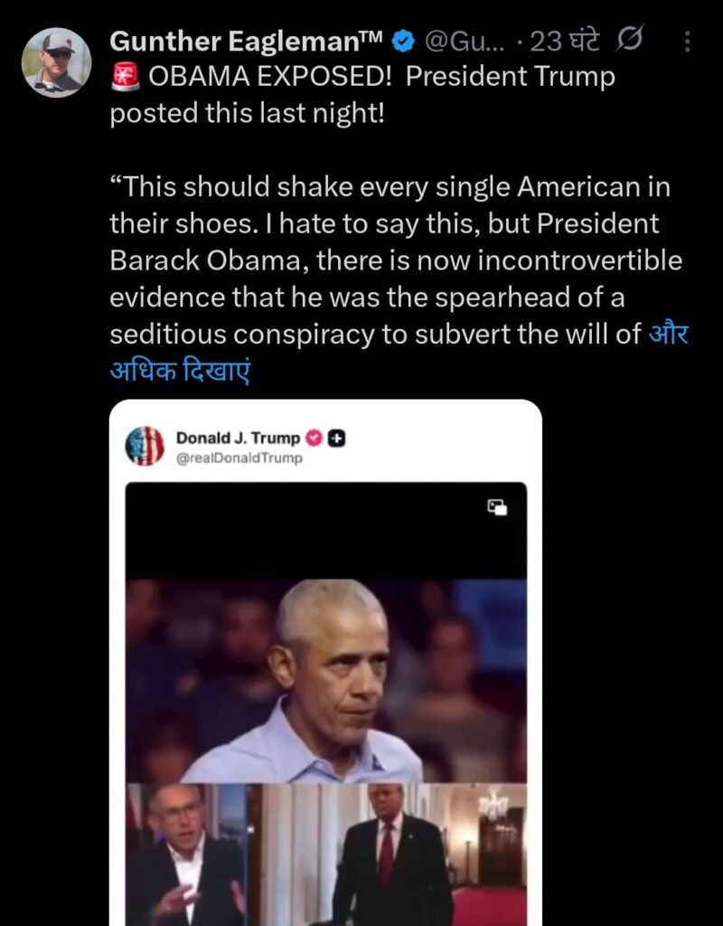 जिसके तहत उन्हें “रूस के साथ साठगांठ” के झूठे आरोपों से जोड़ने की कोशिश की गई। उनका कहना है कि इस मुद्दे ने कई वर्षों तक अमेरिकी राजनीति को प्रभावित किया और उनके राष्ट्रपति कार्यकाल की साख को नुकसान पहुंचाया। हालांकि, इन आरोपों को लेकर अब तक कोई स्वतंत्र पुष्टि सामने नहीं आई है। राजनीतिक विश्लेषकों का मानना है कि यह बयान अमेरिका में जारी राजनीतिक ध्रुवीकरण का हिस्सा हो सकता है।दूसरी ओर, ओबामा या अन्य आरोपित नेताओं की ओर से इस बयान पर कोई आधिकारिक प्रतिक्रिया नहीं आई है। ऐसे में यह मामला फिलहाल आरोप-प्रत्यारोप तक सीमित है, लेकिन आने वाले समय में इस पर और बहस होने की संभावना है। दूसरी ओर, ओबामा या अन्य आरोपित नेताओं की ओर से इस बयान पर कोई आधिकारिक प्रतिक्रिया नहीं आई है।